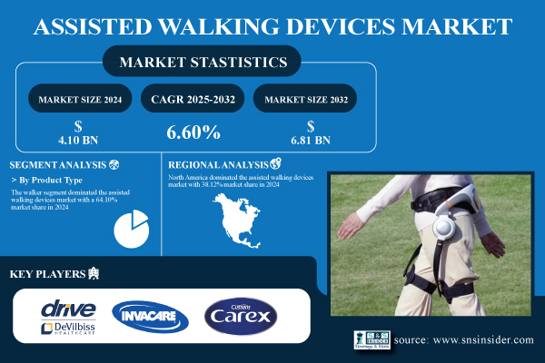 As per the latest SNS Insider analysis, the Assisted Walking Devices Market (歩行補助機器市場) size was USD 4.10 Billion in 2024 and is expected to reach USD 6.81 Billion by 2032 and is anticipated to grow at a CAGR of 6.60% from 2025 to 2032. Increasing demand of countable population base along with rehabilitation programs across the globe, rise in mobility solutions and technologies, and development of growth channels such as e-commerce and distribution channels are some of the factors that are fueling the growth of assisted walking devices market.