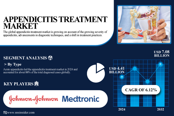 As per S&S Insider Research, The Appendicitis Treatment Market was valued at USD 4.41 billion in 2024 and expected to reach USD 7.08 billion at 2032 growing at steady CAGR of 6.12% during 2025-2032. The U.S. market registered USD 1.18 billion in 2024 and is projected to reach USD 1.73 billion through 2032, with a 4.95% CAGR for the forecast period. The global increase of appendicitis cases, with estimates placing the number around 17.7 million annually, along with the better diagnostic tools and surgical technologies, is positively driving the market growth.