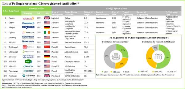 - Market Landscape: A comprehensive evaluation of Fc and glycoengineered antibodies, based on several relevant parameters, such as phase of development, type of engineering, impact of engineering, biological target, type of therapy, target disease indication, therapeutic area, route of administration and popular Fc engineering technologies.