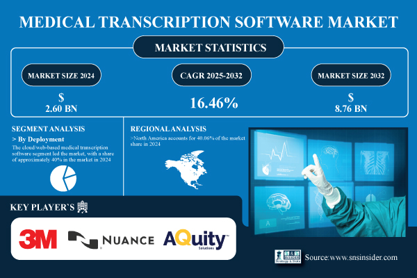 Austin, Oct. 01, 2025 (GLOBE NEWSWIRE) -- According to S&S Insider, the Medical Transcription Software Market size was valued at USD 2.60 billion in 2024 and is expected to reach USD 8.76 billion by 2032, growing at a CAGR of 16.46% over the forecast period of 2025-2032. The U.S. medical transcription software market size was valued at USD 0.93 billion in 2024 and is expected to reach USD 3.06 billion by 2032, growing at a CAGR of 16.09% over the forecast period of 2025-2032.