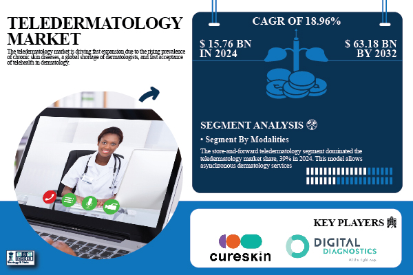 According to S&S Insider, the Teledermatology Market size was USD 15.76 billion in 2024 and is projected to reach USD 63.18 billion by 2032, registering a CAGR of 18.96% from 2025 to 2032. The U.S. market alone commands a 28.5% global share and valued at USD 4.47 billion in 2024, expected to grow to USD 17.60 billion by 2032 due to strong governmental and regulatory backing.