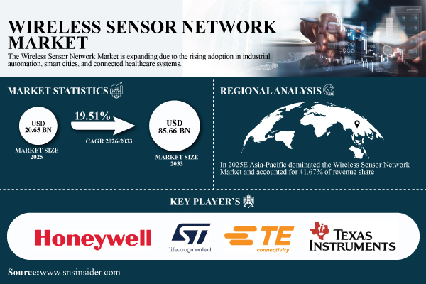 According to the SNS Insider,“The Wireless Sensor Network Market size was worth USD 20.65 Billion in 2025E and is projected to reach USD 85.66 Billion by 2033, growing at a CAGR of 19.51% during 2026-2033.”