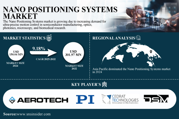 According to the SNS Insider,“The Nano Positioning Systems Market Size was valued at USD 150.04 Million in 2024 and is projected to reach USD 301.97 Million by 2032, growing at a CAGR of 9.18% during 2025-2032.”