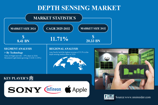 According to the SNS Insider,“The Depth Sensing Market Size was valued at USD 8.41 Billion in 2024 and is projected to reach USD 20.33 Billion by 2032, growing at a CAGR of 11.71% during 2025-2032.”