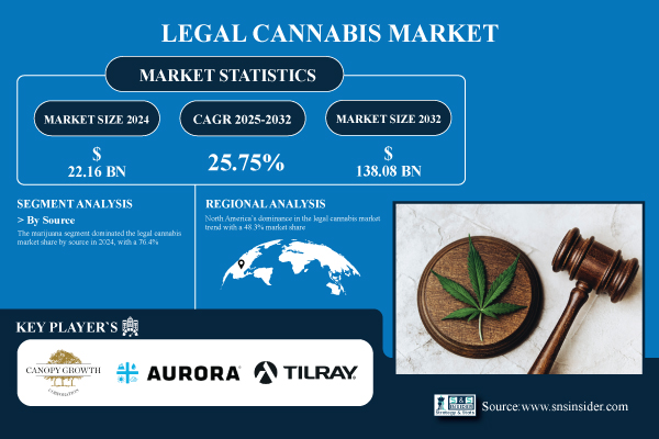 According to SNS Insider, the Legal Cannabis Market was valued at USD 22.16 billion in 2024. The market is projected to grow to USD 138.08 billion in the coming period (2025-2032), at a compound annual growth rate (CAGR) of approximately 25.75%. In the US in particular, the legal cannabis market was valued at USD 29.15 billion in 2024 and is expected to reach USD 144.15 billion by 2032, at a rate of growth of around 22.15% per year.