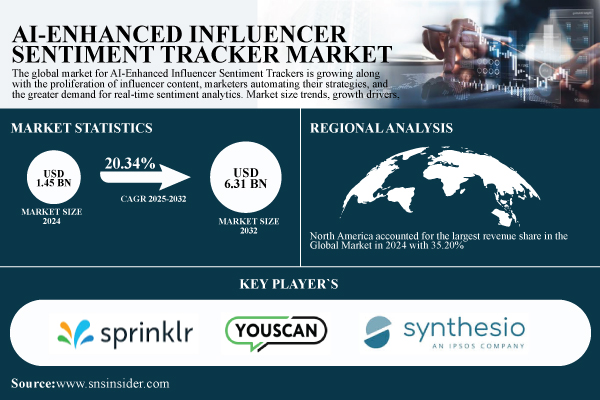 Austin, Oct. 24, 2025 (GLOBE NEWSWIRE) -- The AI-Enhanced Influencer Sentiment Tracker Market size was valued at USD 1.45 billion in 2024 and is expected to reach USD 6.31 billion by 2032 and grow at a CAGR of 20.34% over the forecast period of 2025-2032.